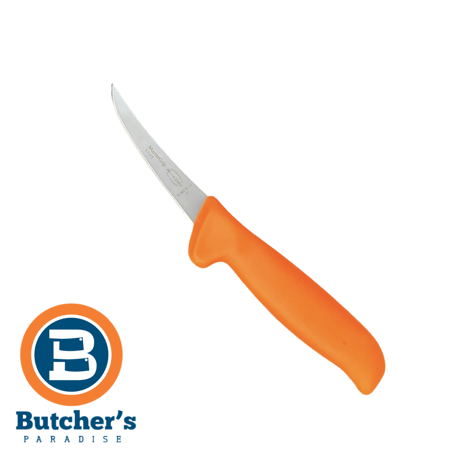 Create a sharp precise cuts with the Friedr. Dick 8288210-53 4″ MasterGrip Boning Knife, Curved, Semi-Flexible Blade, Orange Handle. Designed with a curved semi flexible blade, this stainless steel boning knife cuts through bone, skin and cartilage easily which makes perfect for preparing all kinds of meat, poultry and fish. Crafted with uncompromising sharpness, its cutting edge delivers long-lasting performance which means less frequent sharpening.