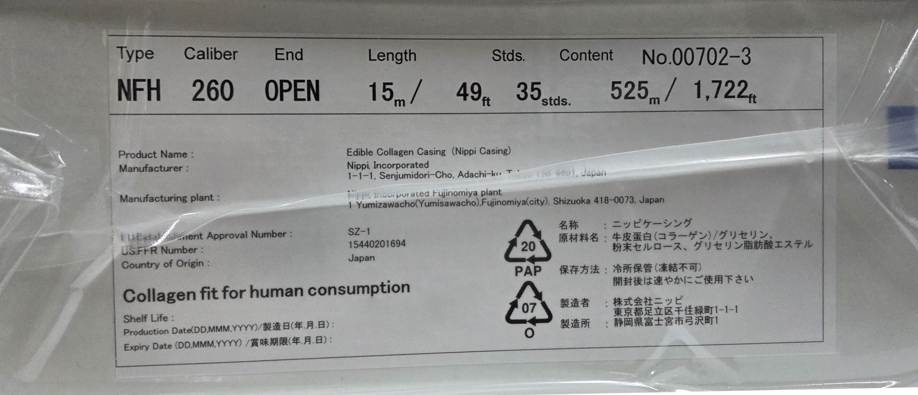 Butcher’s Nippi F260 Fresh Collagen Casing for Sausage Making 525M Made in Japan