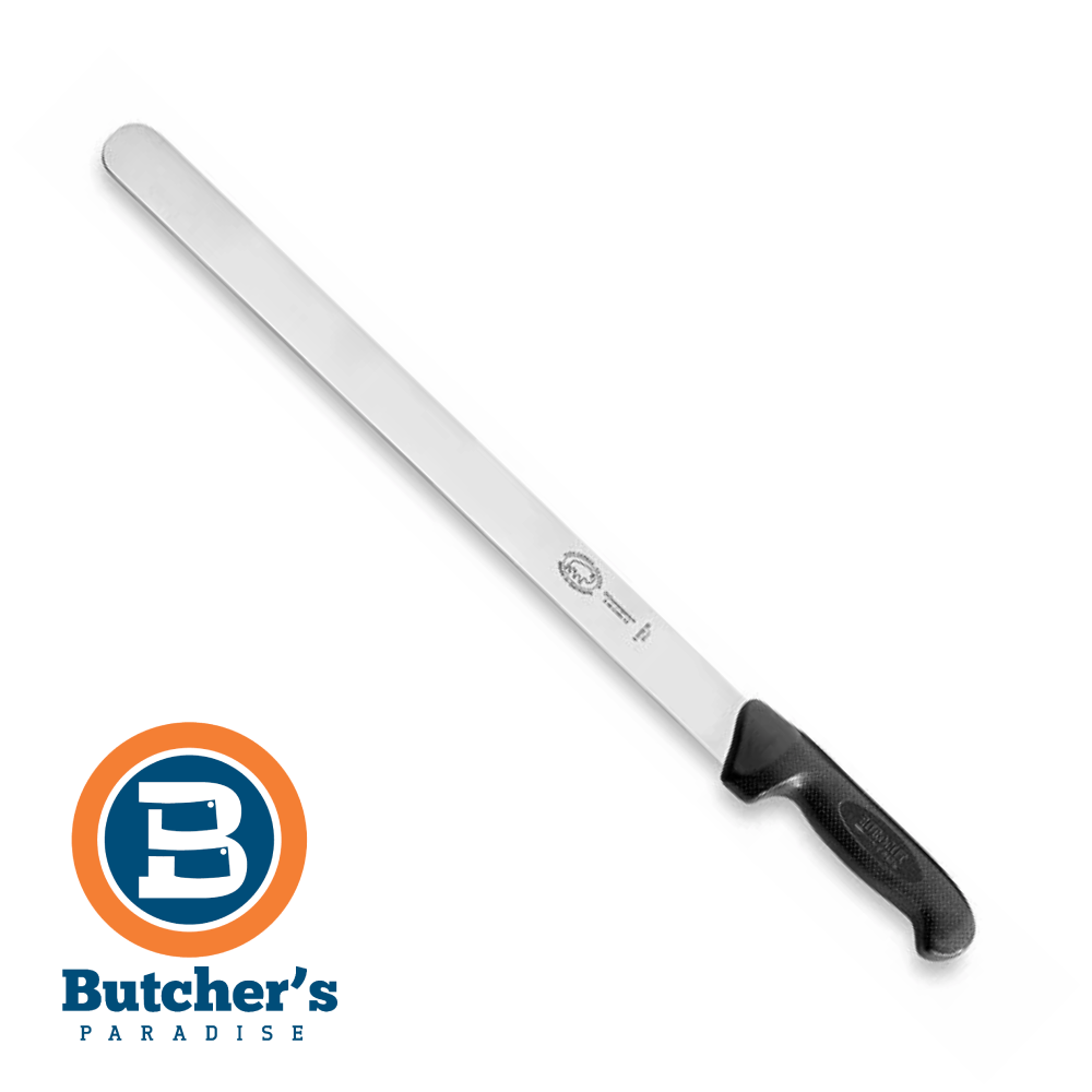 This Kebab Knife from F. Dick is made with high-carbon commercial grade German steel, with a good amount of flexibility to the blade. The handle is comfortable and large, easy to grip. Great for Slicing Meat for Kebab, Gyros, Fajitas, Shawarma, Al Pastor, and more.
