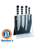 F.Dick 1905 Series 4 Knife Block are a blend of tradition and modernism with the new version of the historic design. Distinctively steel rings, inseparably and seamlessly connected to high-quality and durable plastic in a hygienic manner. Half bolster enabling full use of cutting edge. Characterized by a thin blade with V-shaped cutting edge. Includes Santoku Kullenschliff Knife 18cm, Chef Knife 21cm, Bread Knife, Serrated Edge 21cm, Paring Knife 9cm.